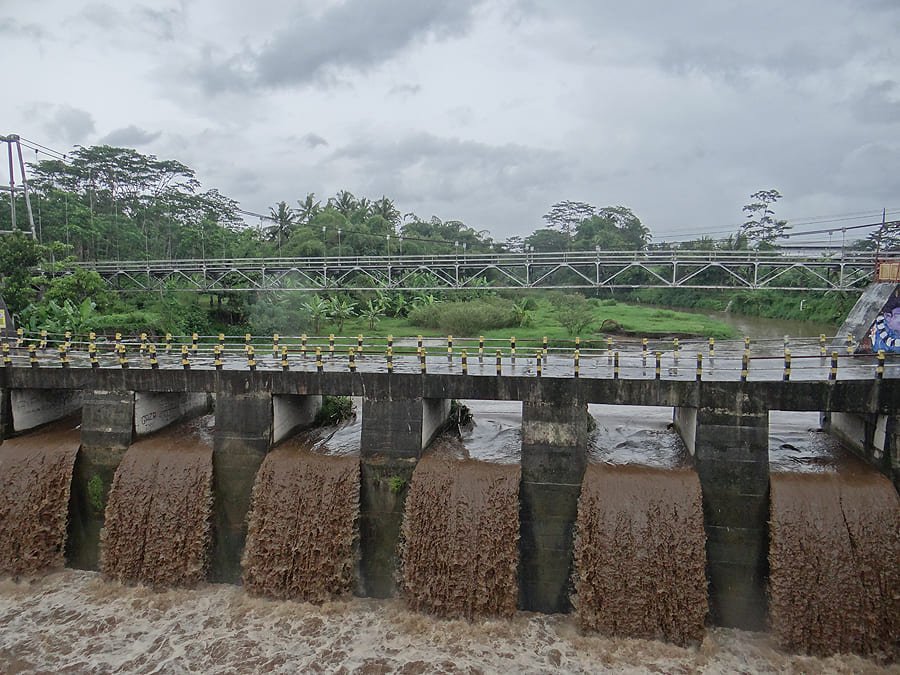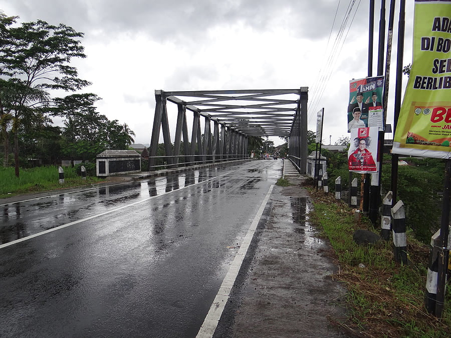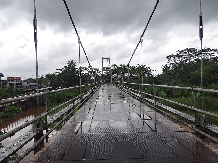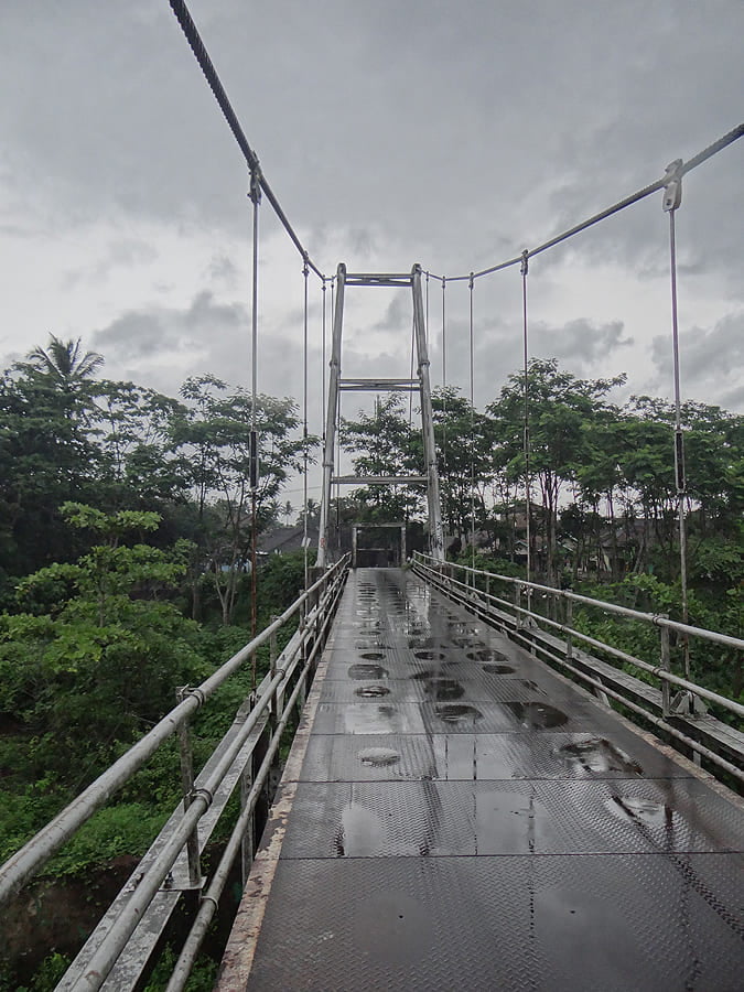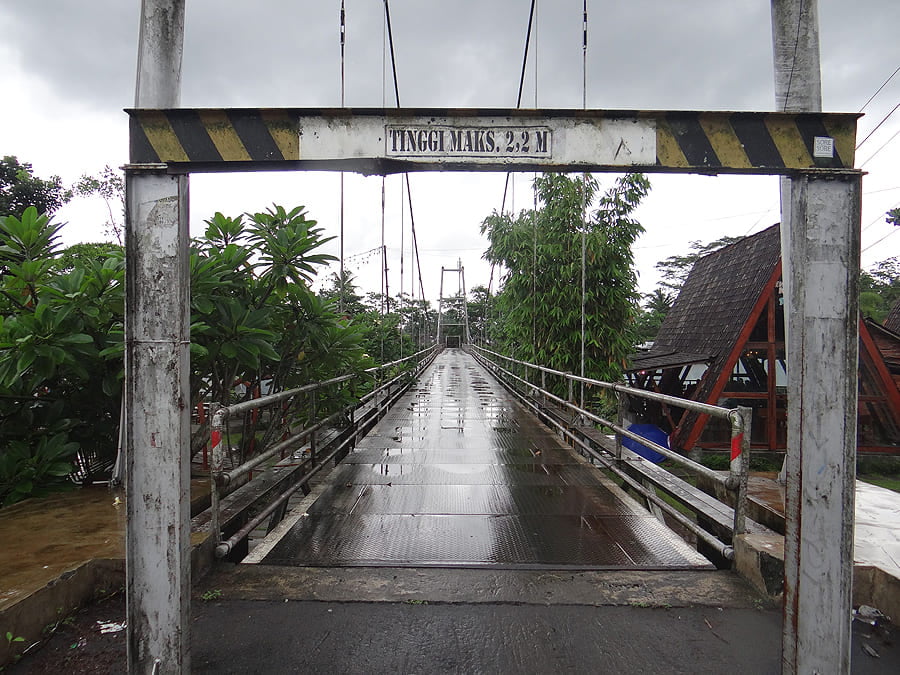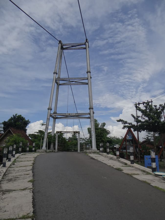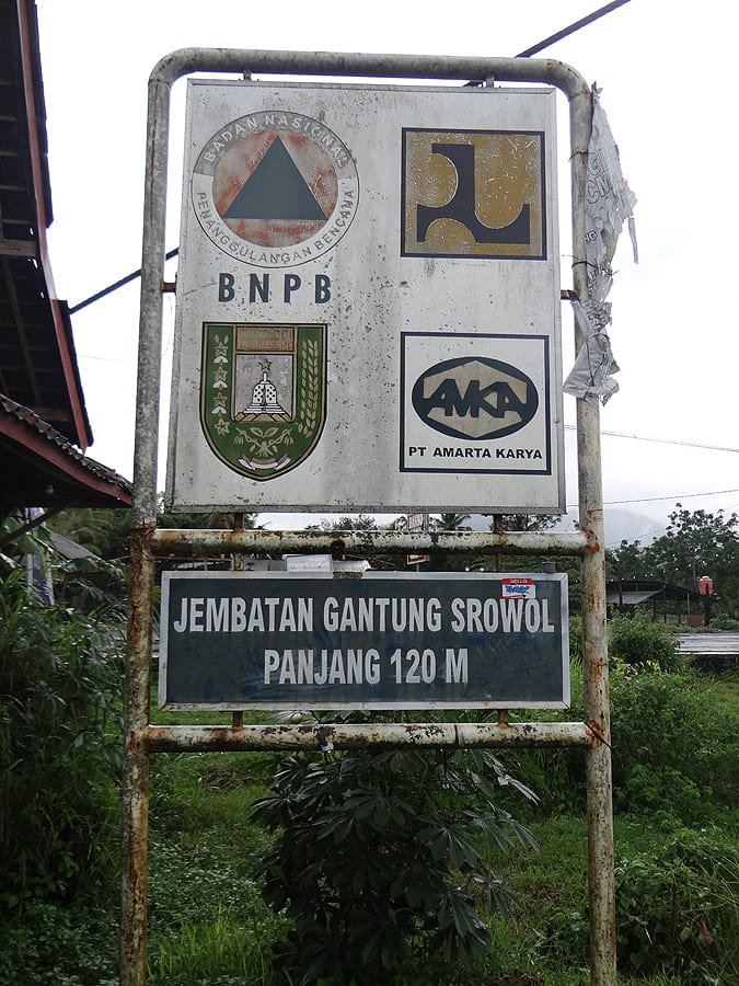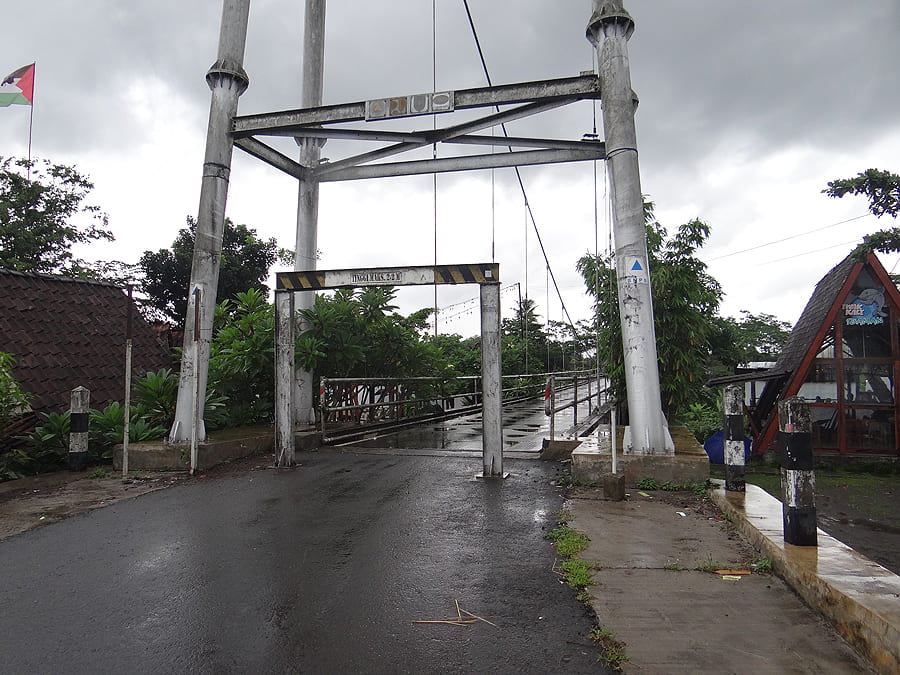 The Srowol suspension bridge is a bridge that connects the two villages Progowati and Japunan in Magelang Regency, Central Java. This bridge is only accessible to pedestrians, bicycles and motorcycles. Next to this bridge is a so called Sabodam. This dam plays an important role in the drainage of material from the Gunung Merapi volcano. For the main traffic there is a bridge available, next to the sabodam. So there are actually 3 bridges next to each other at this location.